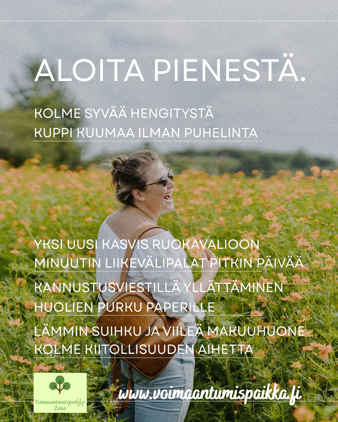 Mikä näistä hyvinvointia lisäävistä pienistä askelista tuntuu sinusta helpoimmalta kokeilla? Aloita siitä ja testaile pientä hyvän lisäämistä muutaman päivän ajan, oloasi kuulostellen. Joskus riittää yksi pieni askel, jotta uudet mahdollisuudet alkavat näkyä.
